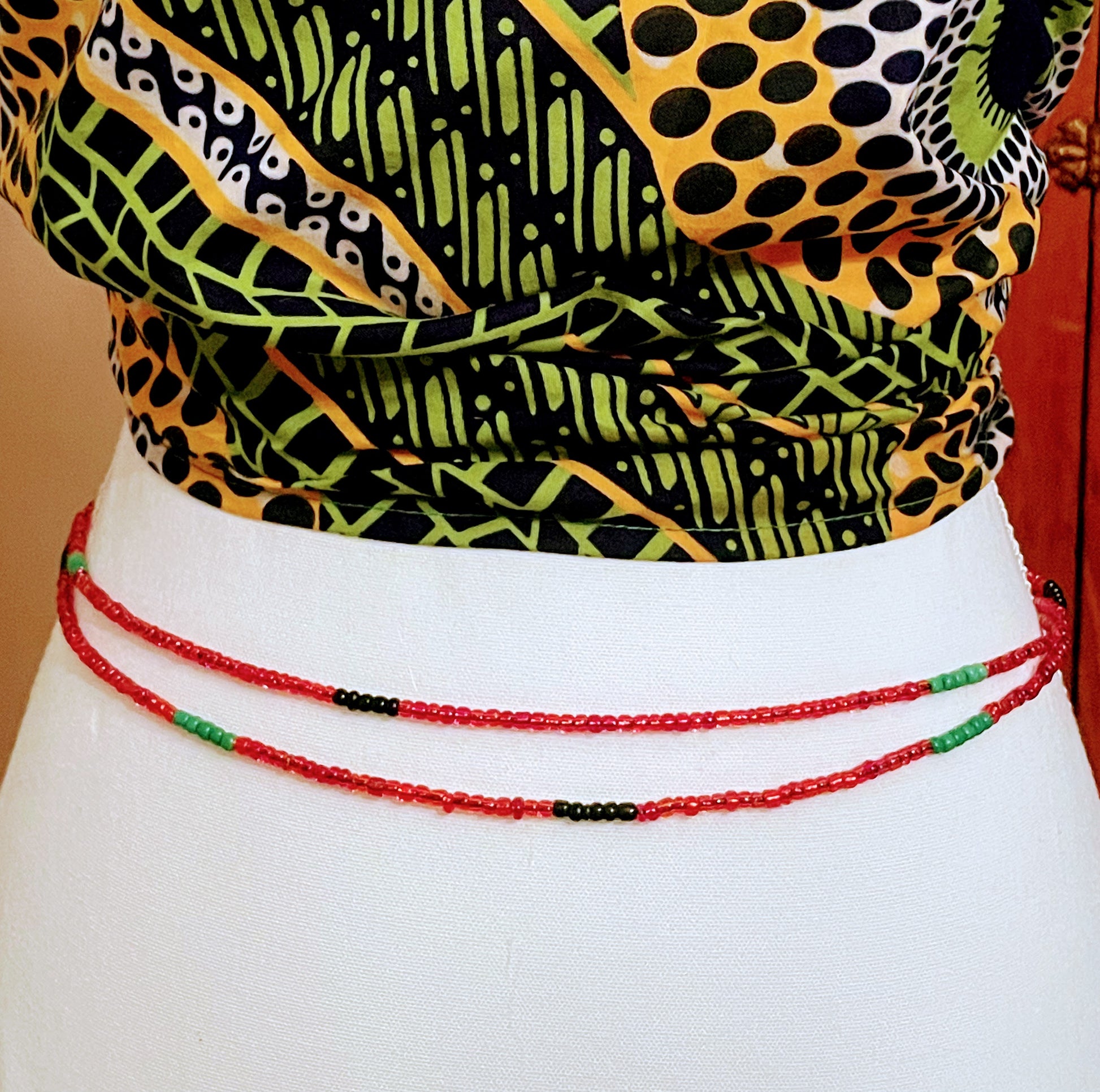 Inspired by the rich heritage of the African Diaspora, this waist bead combines striking red, black, and green beads to symbolize strength, unity, and cultural pride. Carefully crafted for a refined look, it adds a meaningful touch to your style while celebrating heritage with elegance and sophistication.