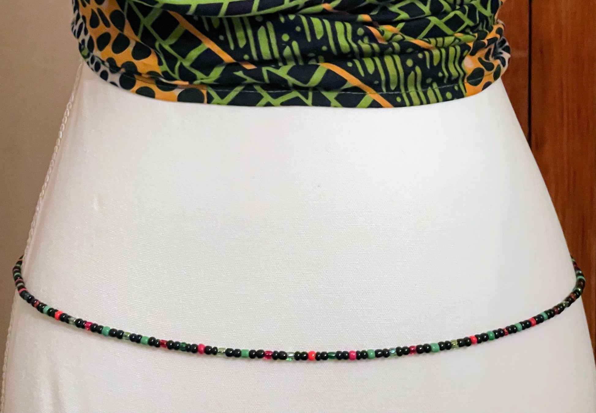 Diaspora II is a sophisticated waist bead crafted in the iconic red, black, and green colors of the African diaspora. Designed to celebrate heritage with elegance, this piece offers both cultural significance and a subtle, refined accent that enhances your personal style.