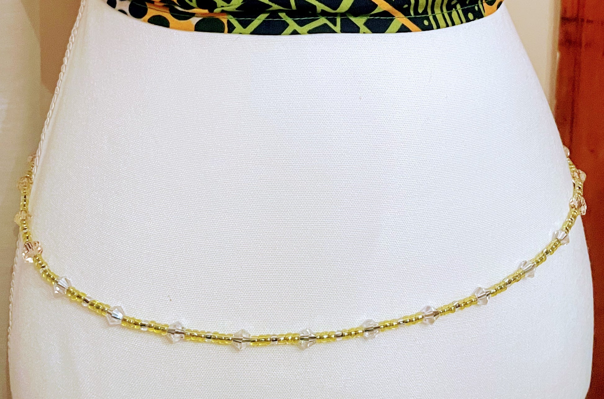 The Iced Lemonade waist bead features a graceful blend of clear yellow beads and sparkling clear crystals. This sophisticated accessory lends a subtle luminosity and refined charm, perfect for complementing your style with a touch of elegance and individuality.